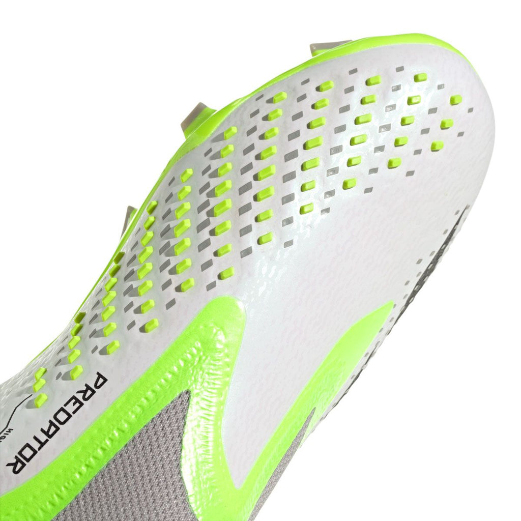 The adidas predator Accuracy+ Firm Ground Junior Soccer Cleat was crafted for goal scoring, it doesn?t matter what corner just know the ball will end up in the back of the net. These cleats have a Laceless construction that gives you a bigger strike zone, soft HybridTouch upper with High Definition Grip rubber elements that give you enhanced grip on the ball. Two-piece adidas PRIMEKNIT collar secures your foot and firm ground outsole gives you great traction on firm ground surfaces. Cleats made for pinpoint shooting.