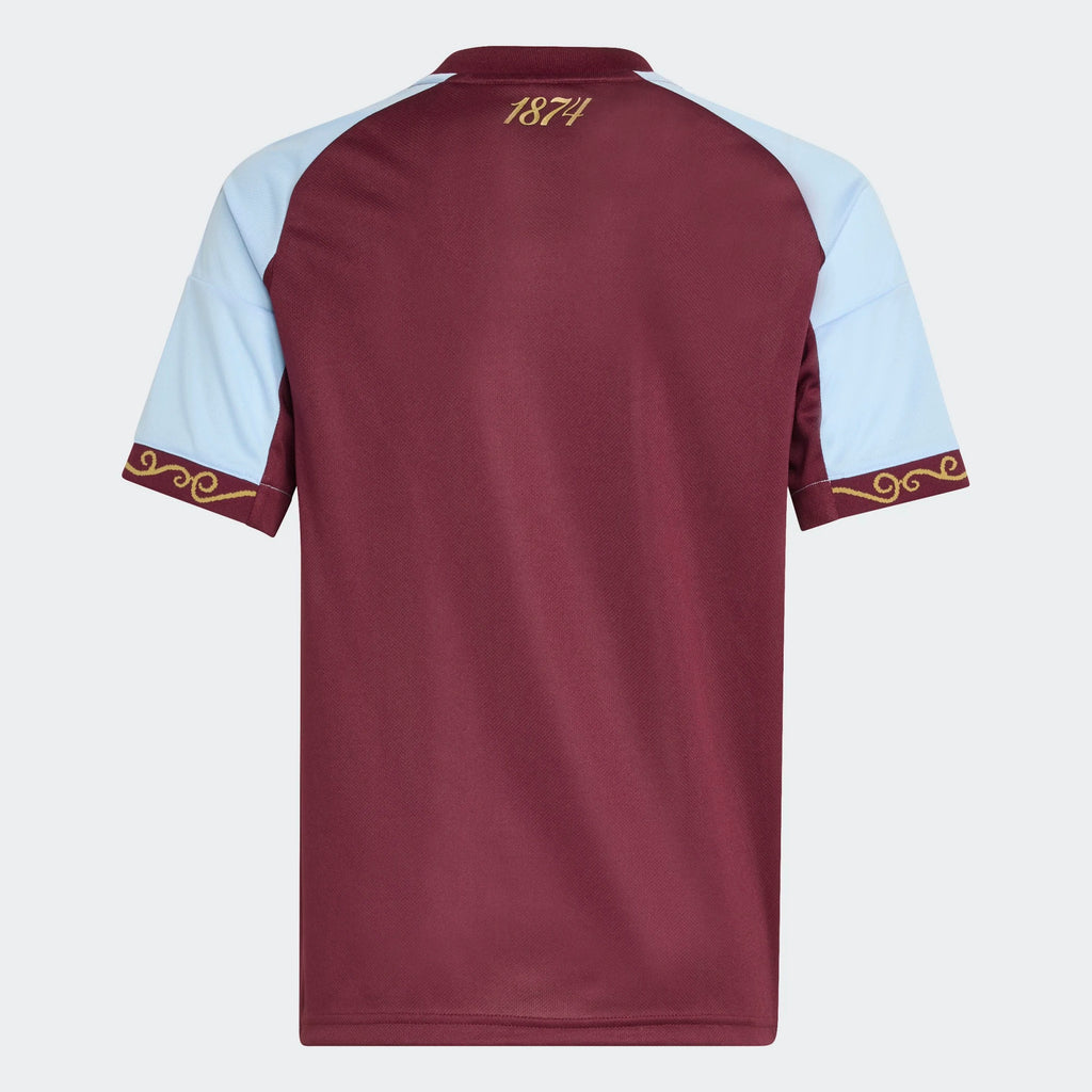 Classic claret and blue. Aston Villa FC jerseys are instantly recognizable around the world. This juniors' one keeps things clean and crisp, while adding extra club DNA courtesy of intricate cuff detailing borrowed from Villa Park's grand facade. Created for comfortable support, this adidas soccer shirt includes moisture-managing AEROREADY. A sewn-on badge completes the standout look.