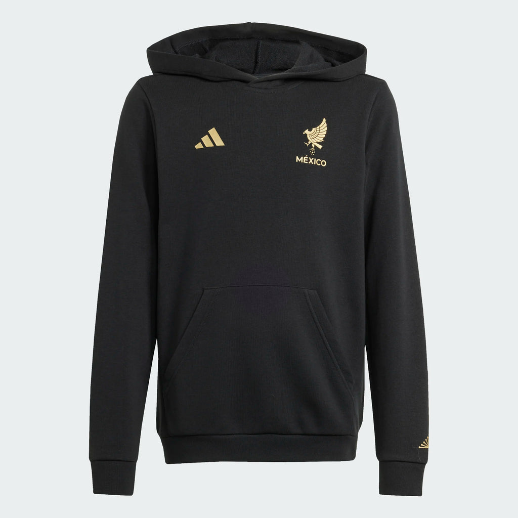 Let your soccer pride shine every time you pull on this juniors' adidas Mexico hoodie. Belonging to a special collection headlined by an eye-catching match kit, it features a golden 3 Bar Logo and team badge on the chest. The French terry fabric and ribbed cuffs ensure you stay comfortable while you treasure your team.
